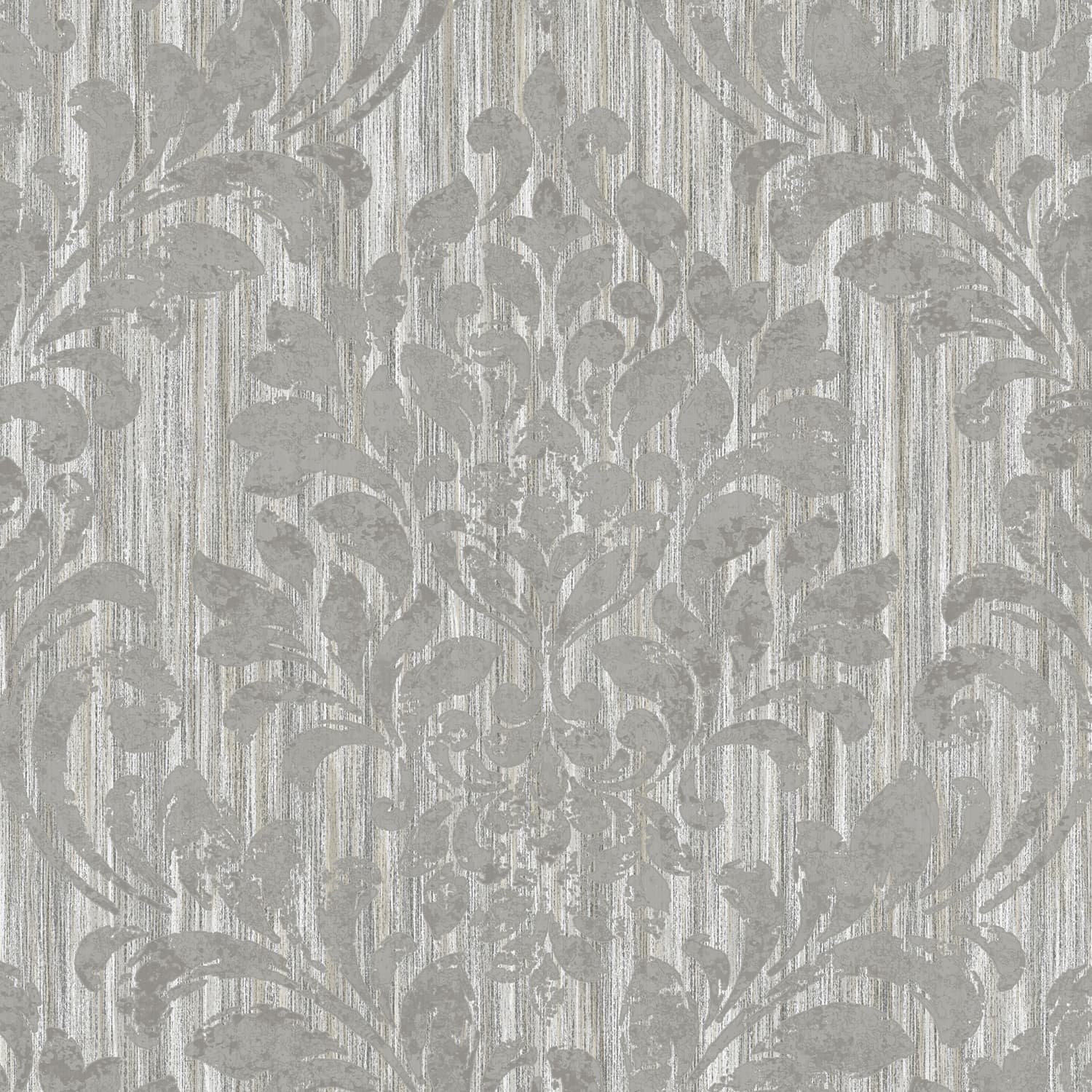 The motif is layered over a softly textured vertical strié background and rendered in soothing shades of grey and warm taupe.