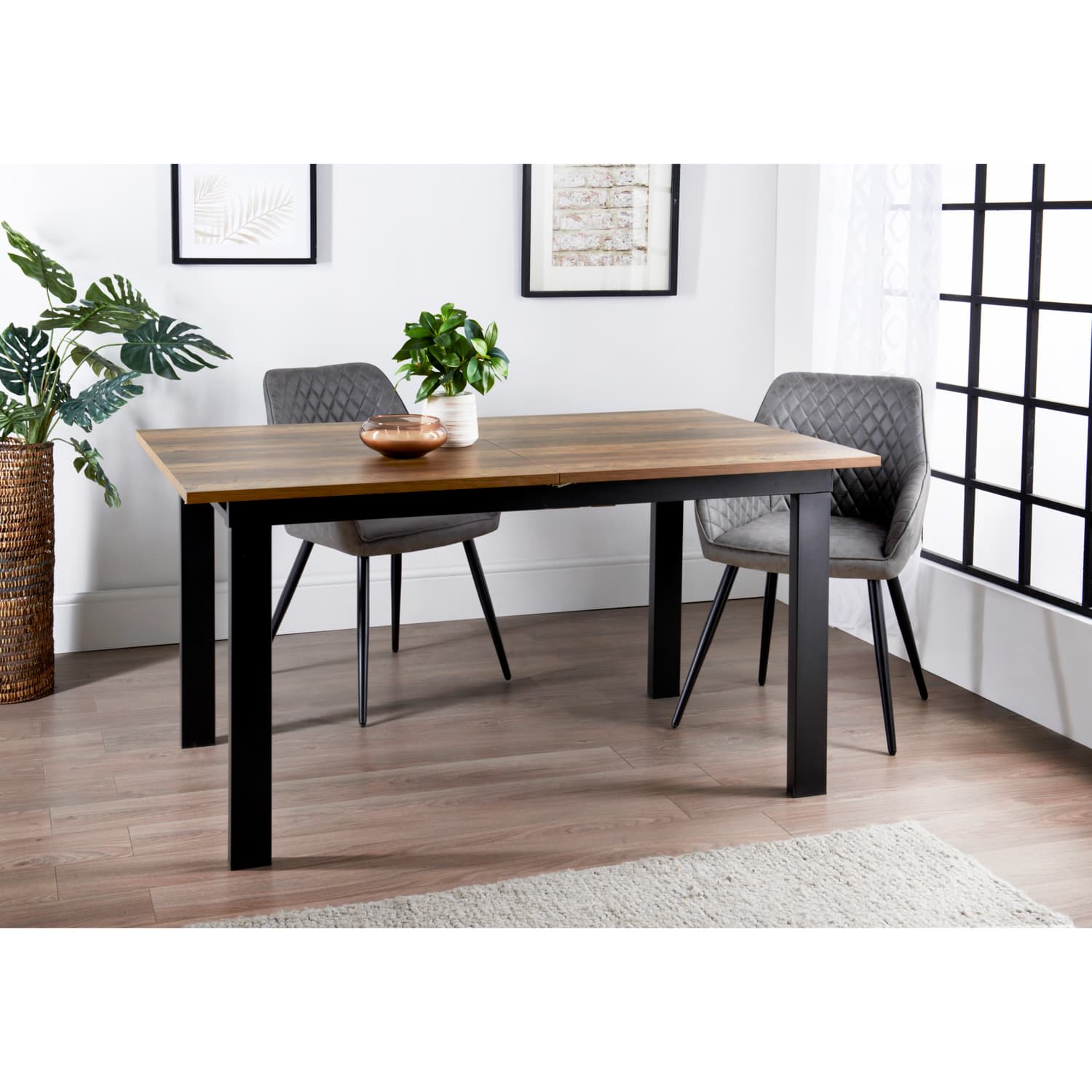 This Tromso Extendable Dining Table is a great addition to any home dining space, complementing most home interiors seamlessly with a sleek oak finish and black metal legs.